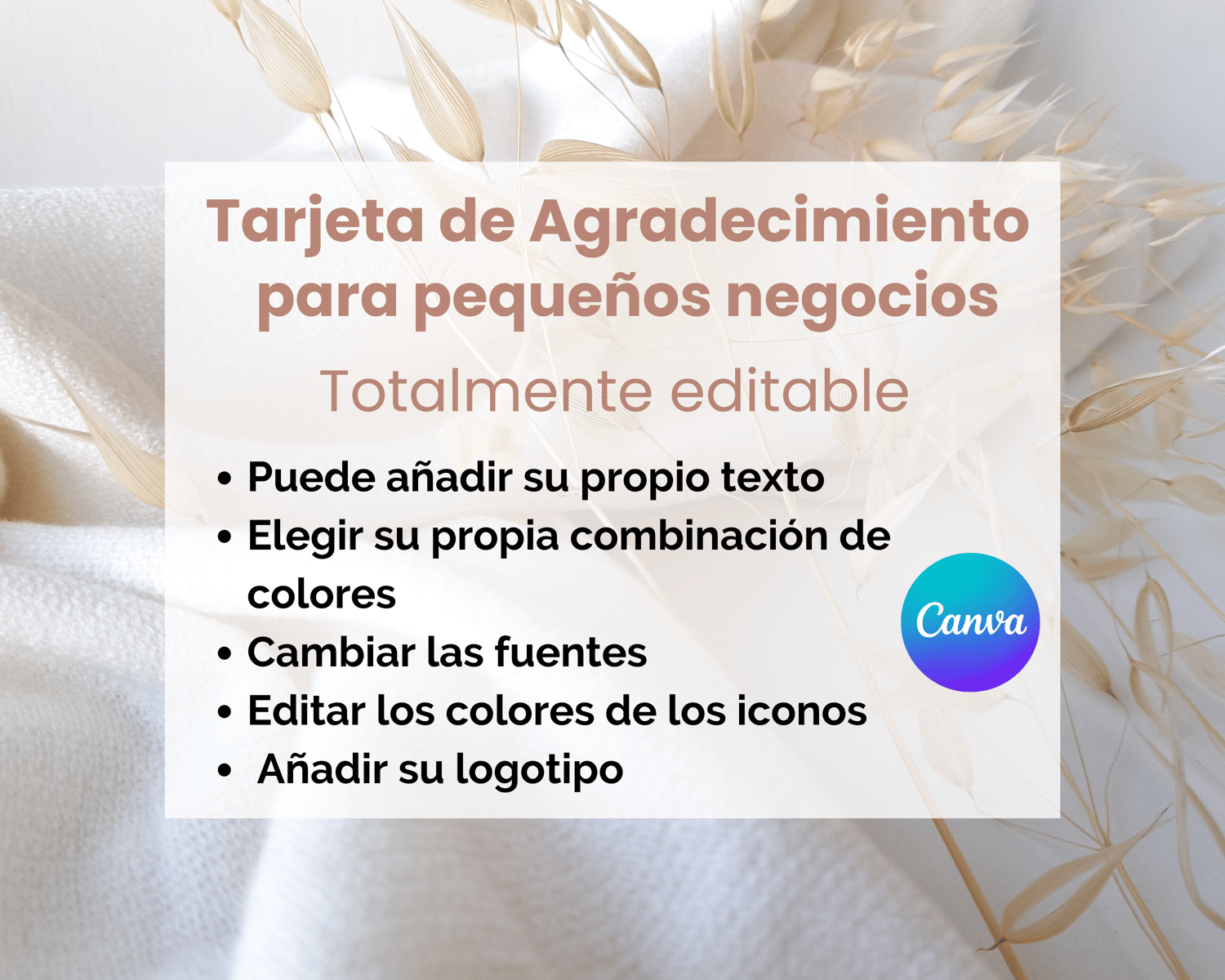 Esta tarjeta de agradecimiento editable es una herramienta valiosa para cualquier pequeño negocio que quiera mostrar su aprecio a sus clientes. Con un diseño moderno y personalizable, puedes crear un mensaje de agradecimiento que sea único y refleje la identidad de tu empresa. Además, es totalmente editable, puede añadir su propio texto, elegir su propia combinación de colores, cambiar las fuentes, editar los colores de los iconos, añadir su logotipo, etc. Solo necesitas una cuenta gratuita de Canva.