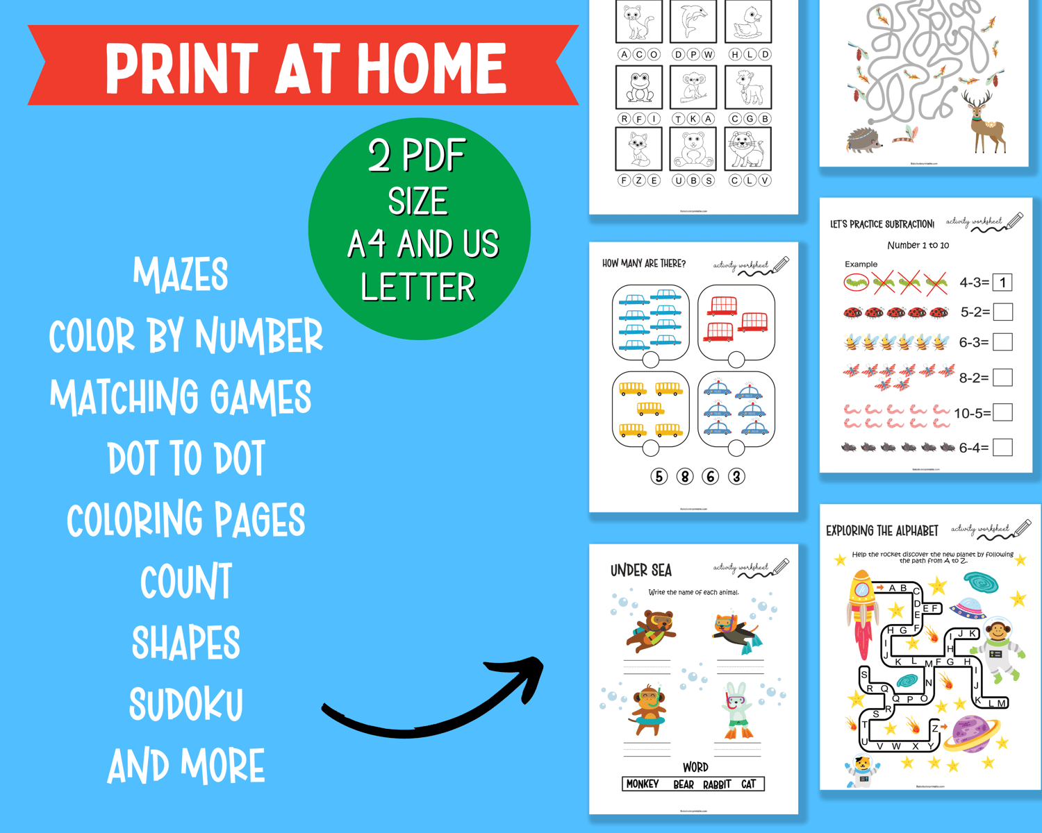 You will find a wide range of engaging and challenging puzzles that are designed to help young children develop their problem-solving skills and fine motor coordination. From mazes and dot-to-dot puzzles to color-by-number and matching games.