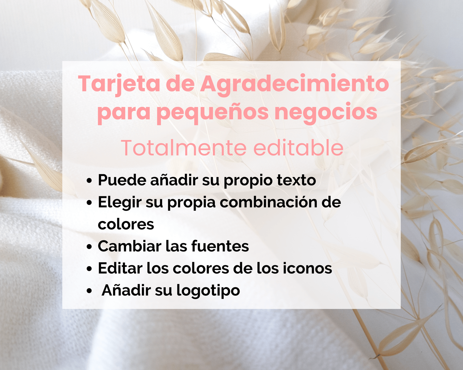 Esta tarjeta de agradecimiento editable es una herramienta valiosa para cualquier pequeño negocio que quiera mostrar su aprecio a sus clientes. Con un diseño moderno y personalizable, puedes crear un mensaje de agradecimiento que sea único y refleje la identidad de tu empresa. Además, es totalmente editable, puede añadir su propio texto, elegir su propia combinación de colores, cambiar las fuentes, editar los colores de los iconos, añadir su logotipo, etc. Solo necesitas una cuenta gratuita de Canva.